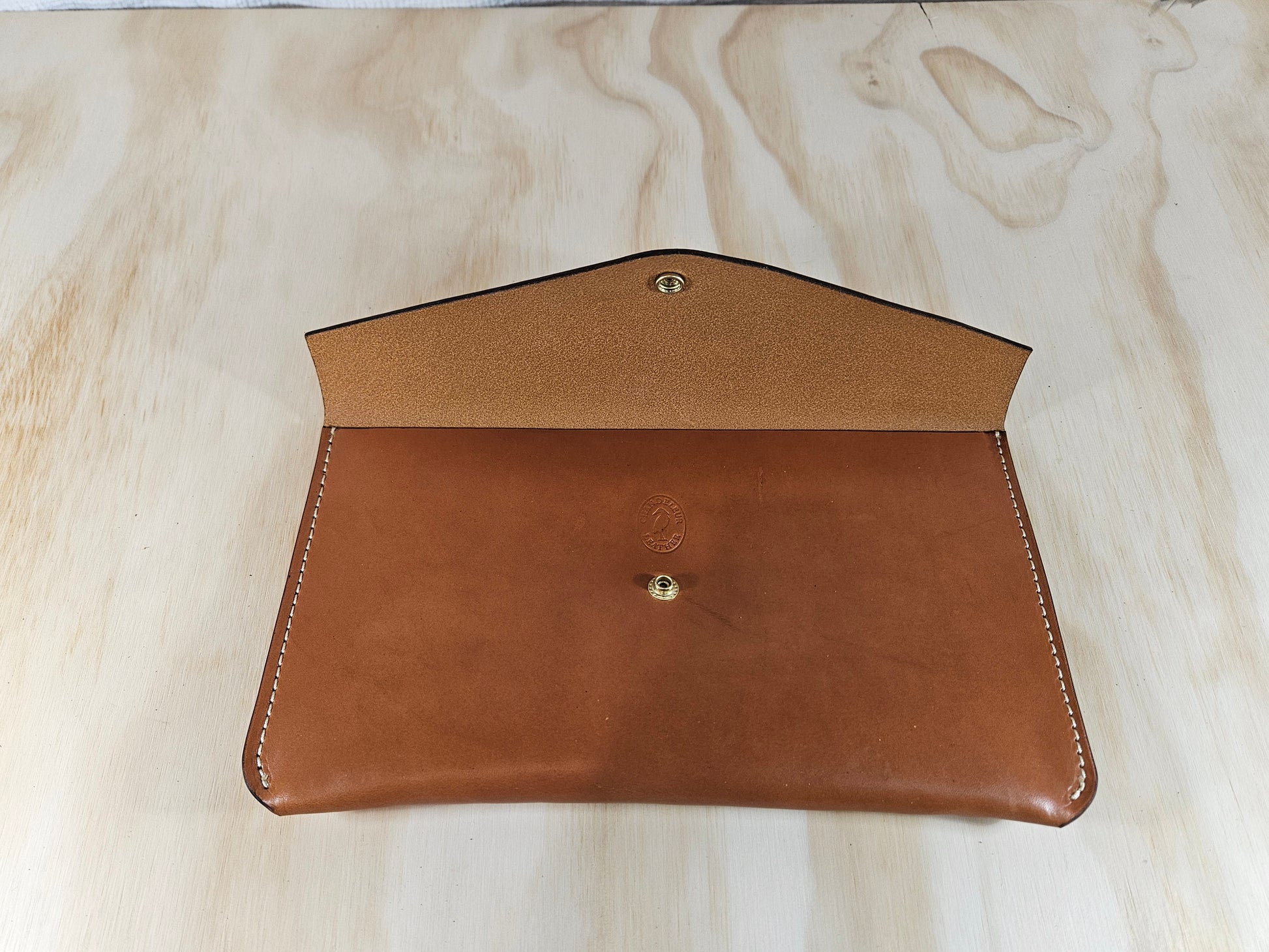 A single brass snap secures the flap, balancing utility with restraint. On the back, an optional “V” hand strap offers an easy way to carry, without breaking the silhouette or compromising the design.
