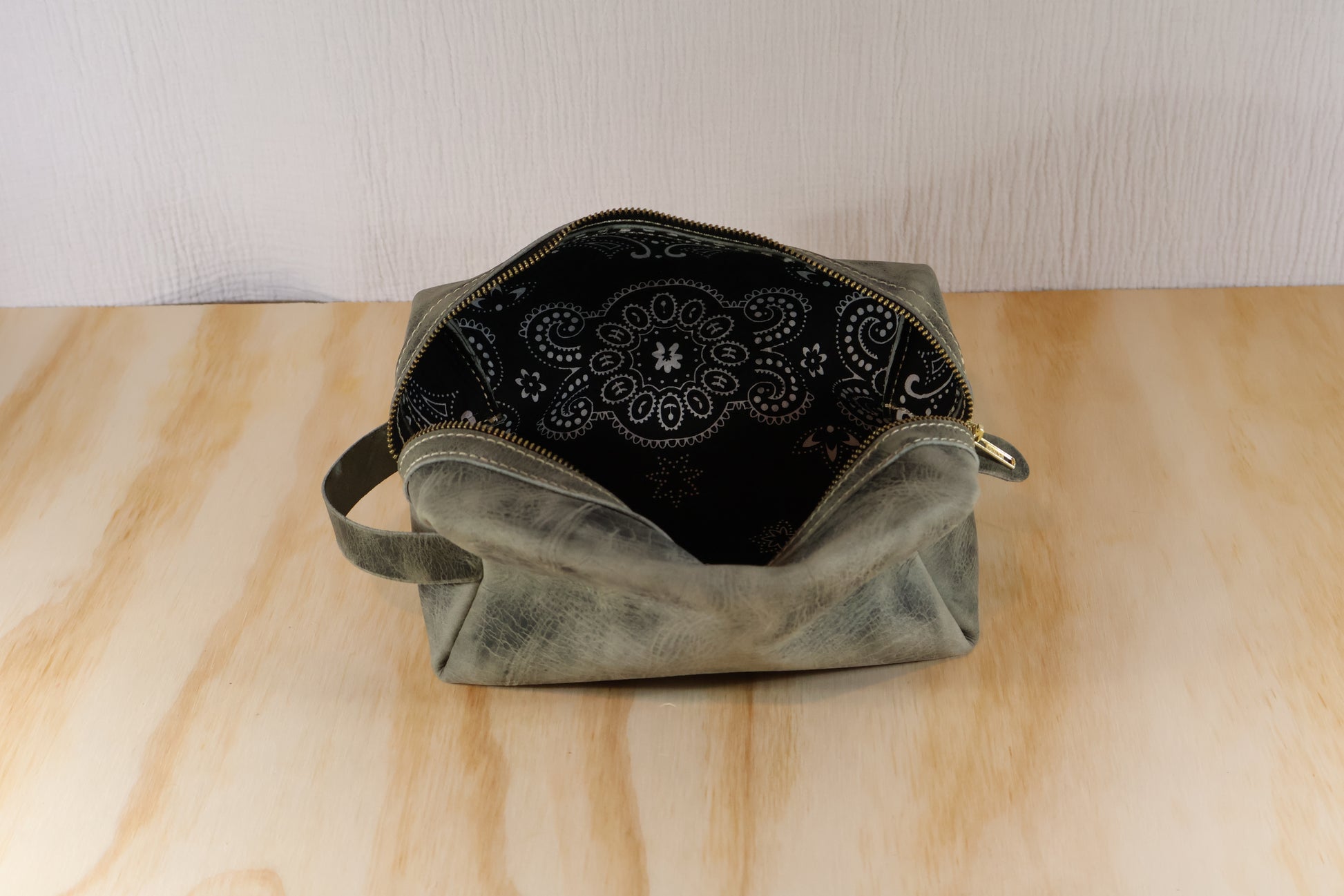 Inside, a single spacious compartment keeps grooming tools, toiletries, or personal items close at hand. A wide zipper opens fully for easy access, while the leather handle makes it easy to grab and go.